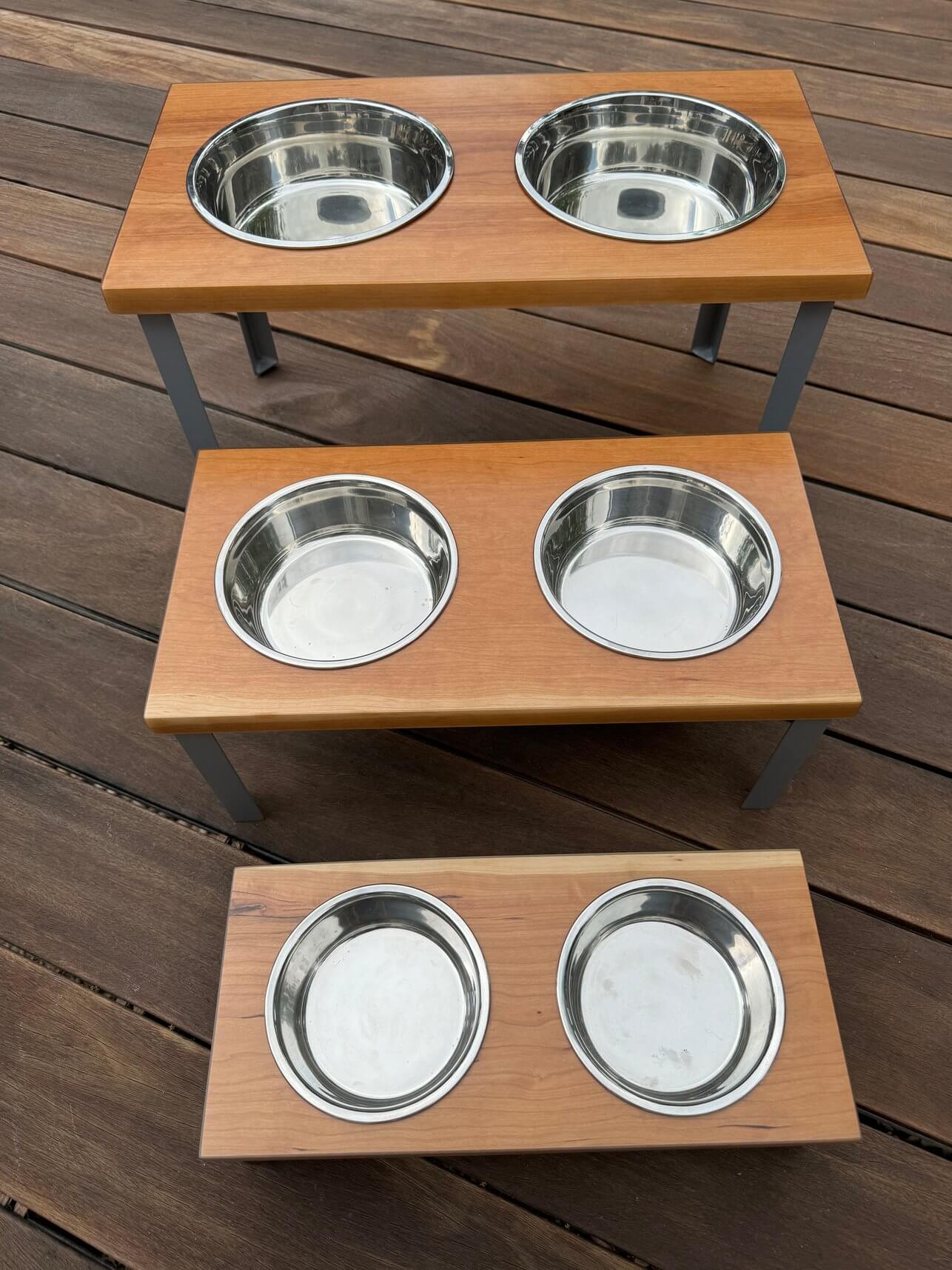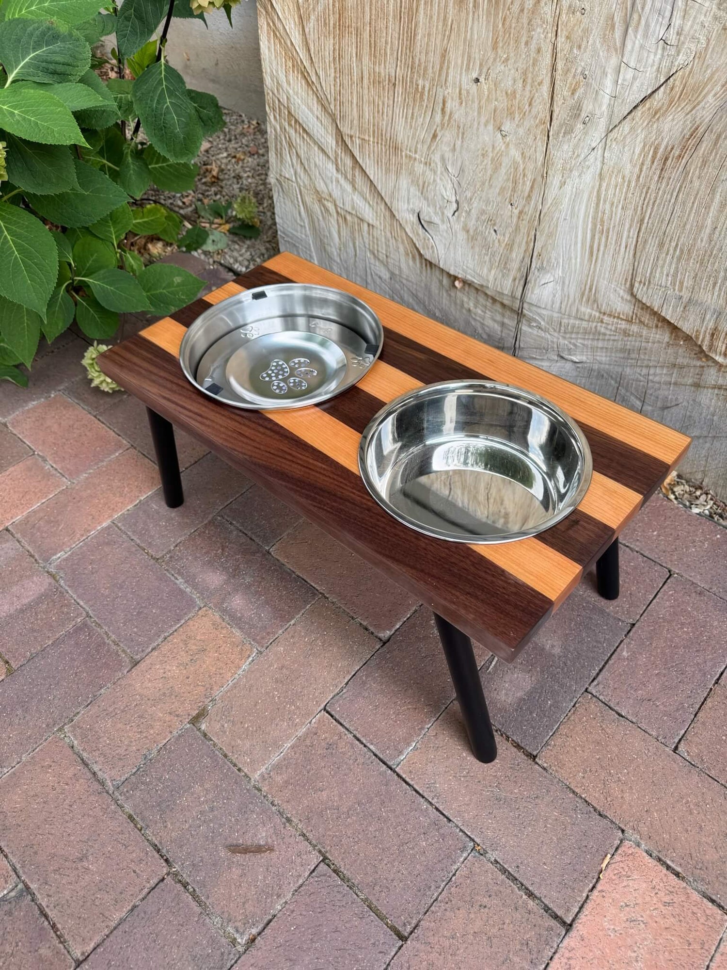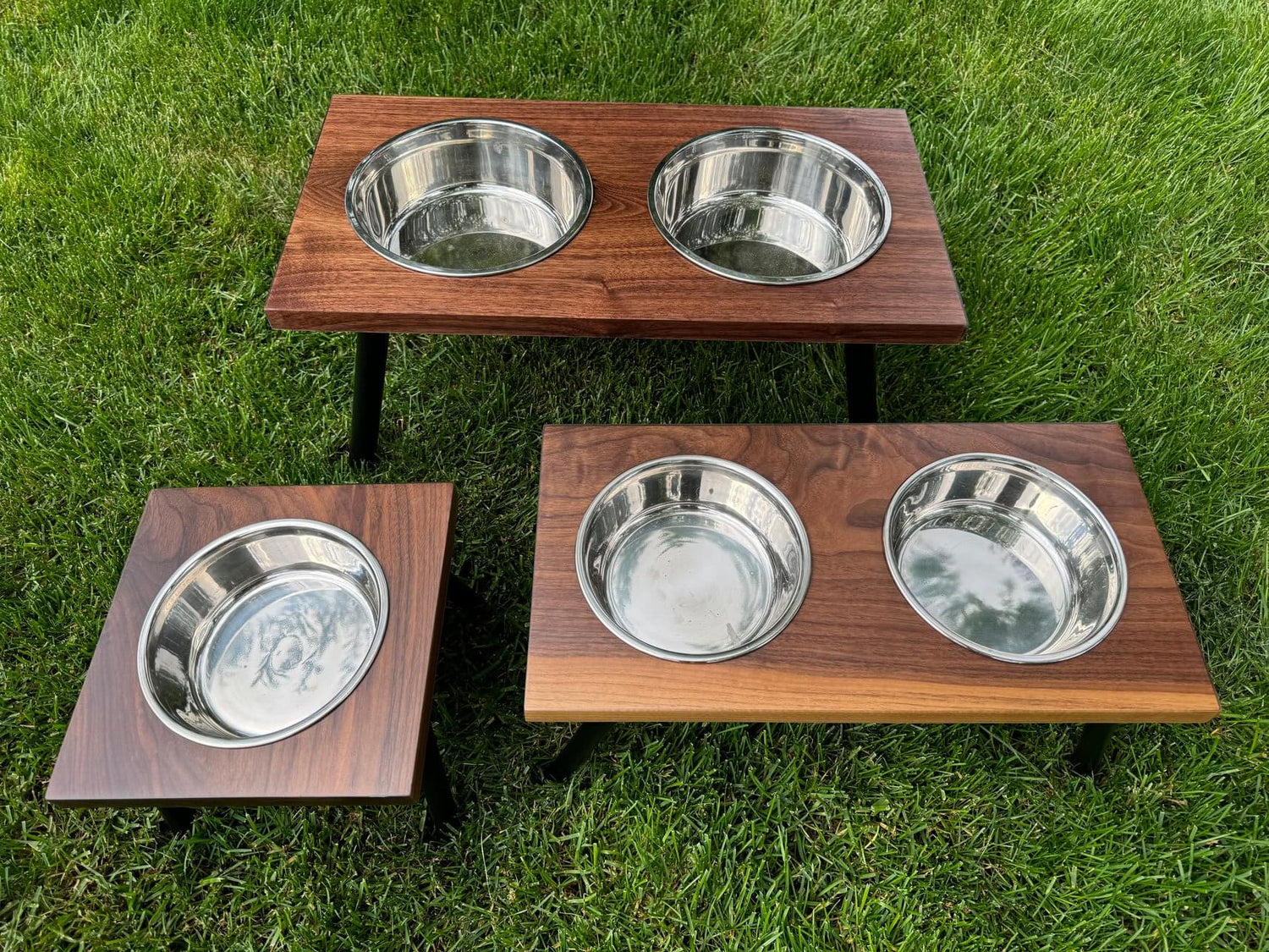 Elevated Pet Products offers a safe and elegant way to provide your pet with food and water. Premium cabinet-grade wood in walnut, cherry, or designed in a mix of both is planed and cut to size. Wood is then sanded, coated in clear or colored epoxy resin, and finished with a gloss or satin sheen. A polyurethane seal adds a protective layer so stands are 100% water-resistant. The multi-step process of primer, paint, and layers of clear coat ensure life-long durability.